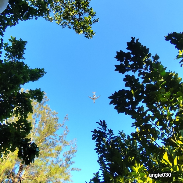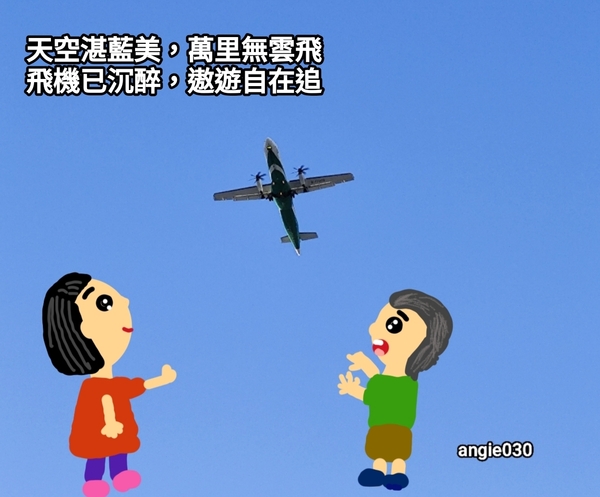 抬頭仰望的視角裡,深淺綠的葉子似伸出雙手要抓取逃離的機器鳥,就差一步,讓機器鳥飛奔離去,樹葉互相指責,一陣颯颯聲響起;而藍色的天際裡,有一架名叫飛機的身影,俯瞰著地上風景,隨著航道定點悠遊於天空懷裡,悠閒從容的前往降落之地。作品「劃過天際」
