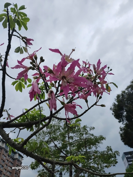 美人樹花在街道佇立,仰望拍攝留下其短暫蹤影,花瓣有的已經凋零無生氣,有的站姿挺立,各有各的魅力,灰色的天際裡,搭配粉紅與翠綠和咖啡色系,突顯了花來過的痕跡,雖然可惜卻期待下個花期。作品「美人記」