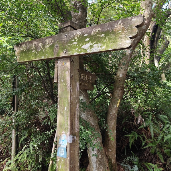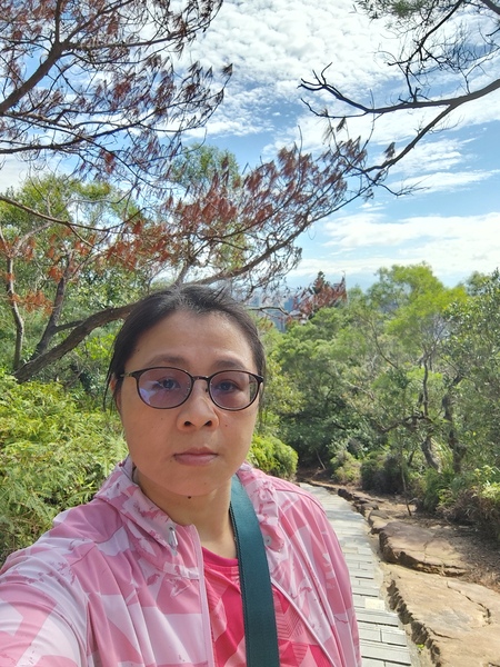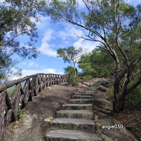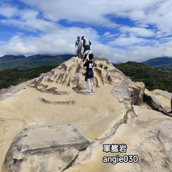走著階梯來到第一個木棧板上,寫著軍艦岩的距離字跡模糊不清晰,剛好遇到下來的長者,詢問攻頂要走多久?長者說「不長,但階梯很多,慢慢走,適時休息」;於是繼續往前走,沿途遇到登山遊客,我問了三到四位「攻頂有多久?」答案從「15分鐘到快到了」。感覺就像是在尋寶一樣,抵達軍艦岩頂,當然又是拍拍拍,停留十分鐘左右,此時來了一群登山隊,將整個頂上擠滿,熱鬧不已。