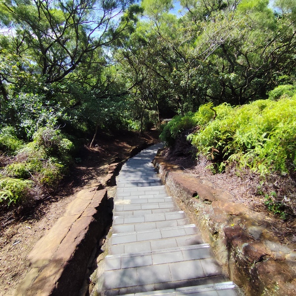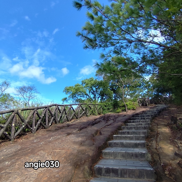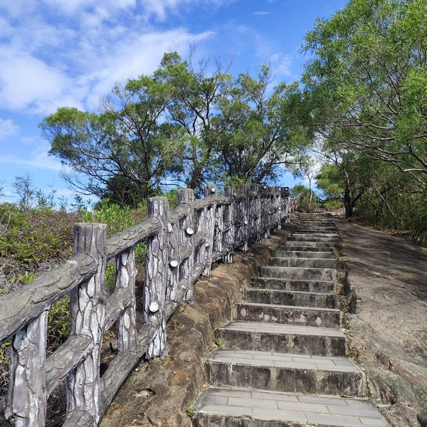 臨時起意的踏青之旅,沿著指標前進,抵達軍艦岩登山口階梯,看著長長的階梯,心裡有些猶豫,不知該不該勇敢往前踏階梯,因為不知道距離有多遠?路況如何全部不清晰?連水都沒帶齊;此舉是否不可行,看看時間還早,決定往上踏階梯。