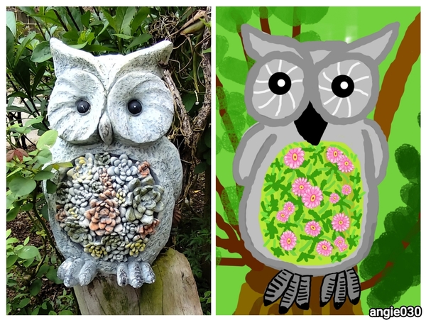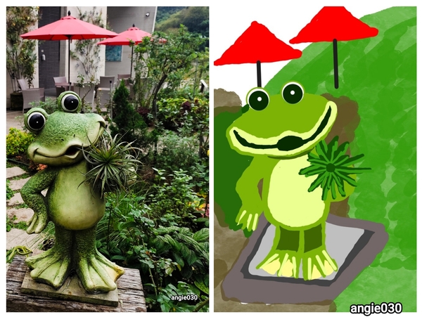眼觀四方貓頭鷹,池塘青蛙捧葉行。