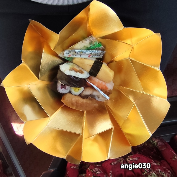 抵達關西機場是11:10分,等領完行李前往搭乘大巴士,我們在車上享用午餐,這壽司餐盒設計得很美,至於壽司較為普通。