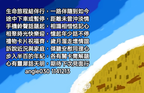 生命旅程結伴行,一路伴隨到如今 途中下車或暫停,距離未曾沖淡情 手機鈴聲話題起,相識相惜惦記心 相聚時光快樂迎,憶起年少話不停 禮物卡片祝福齊,歲月溜走增情誼 訴說近況與家庭,傾聽安慰同理心 步入...