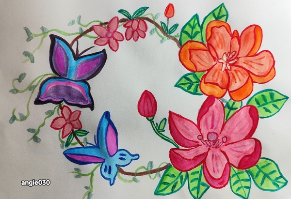 蝶花環繞花圈圓,花色綻放似火炎 蝶兒飛舞閃耀豔,展翅遨遊花叢間 香氣傳遞引蝶戀,繁花似錦滋味甜 花開蝶飛枝蔓延,綠葉相依其美顏 花團錦簇生命線,生活色彩視饗宴 angie030 1141217