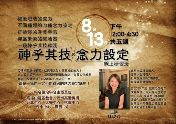 一窺神乎其技就在8/13(五) 林玟玲老師主講的念力設定研習班。