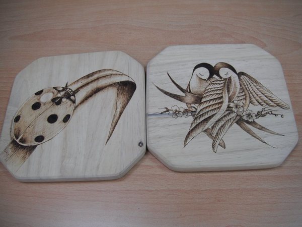 材料:燒烙筆、木器花插、木器四方形、橢圓形木片、旗幟招牌、轉印紙。