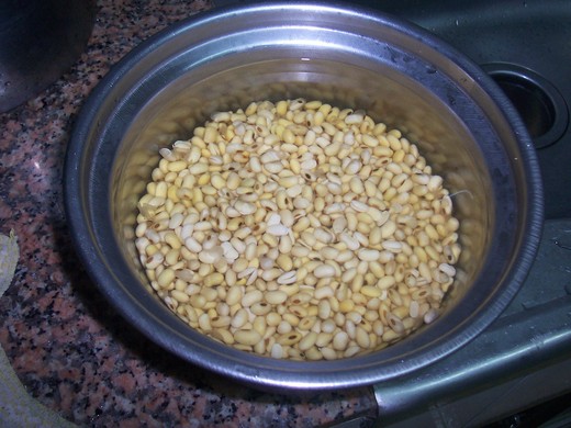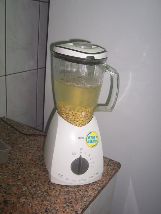 1.黃豆半斤洗淨加滿一鍋水,放入冰箱冰二天,再拿出來分三次,要加冰豆漿的冰水,用果汁機打成汁 ( 瞬間打約一分鐘,高速再打一分鐘 )