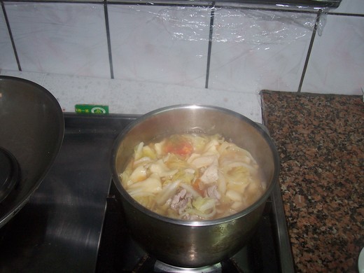 3.準備一湯鍋,放入約六杯水煮滾,改中火,放入蕃苆,秀珍菇,再加入高麗菜一起煮滾.