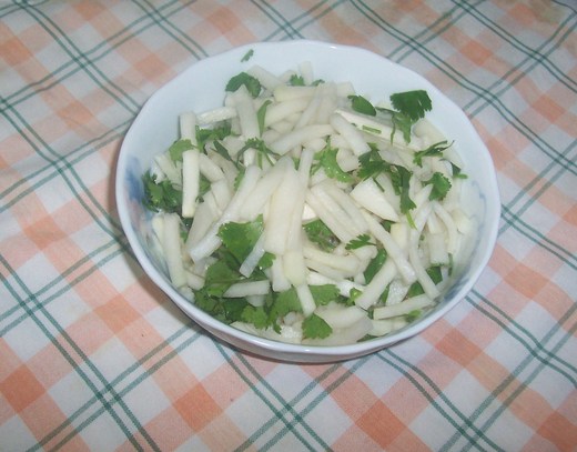 5. 切絲大頭菜加入白醋2瓷湯匙、砂糖2瓷湯匙、大蒜1顆切末,拌勻,放置一天以上,吃時再加入香菜末、香油。