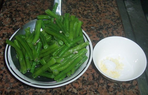 4煮沸一鍋清水放入豇豆汆燙2分,撈起,置入巳冰凍之冷開水中浸泡,