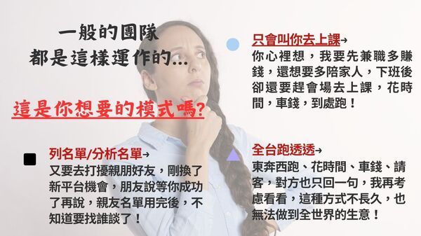 大部分一般的團隊都是這樣運作的...想想看,這是你想要的模式嗎?1.只會叫你去上課學習:你心裡想,我只是想先兼職多賺錢,還想要多陪家人,還有自己想去做的事,下班後卻還要趕公司會場去上課學習,花時間、車錢,東奔西跑!