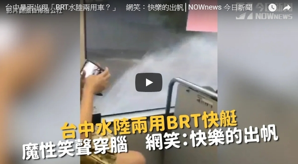 | 只要公車一經過, 濺起的水花就像海浪! 有種乘風破浪Fu呢~ 原PO還興奮的說: 「台中10公里免費『BR快艇』」 整個台中都是我的麗寶樂園!XD 圖/影片來源:FB |
