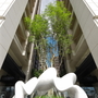 在中庭的水幕旁,是銅雕藝術家陳昭宏的童年系列作品《喜上眉梢》小女孩坐在樹葉上