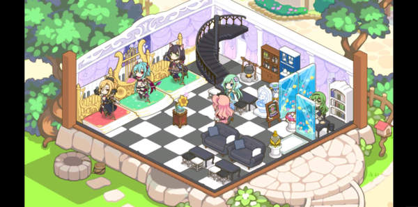 首先1樓美食殿堂經營的餐館,由於公會長貪吃配可的強烈要求,於是經過多次的改建,總算成功讓客廳跟花凜的辦公室和座位區以及廚房吧檯放在同一層樓,特別加入獨家的水族箱牆來做為隔板兼裝飾來治癒公會成員和客人。