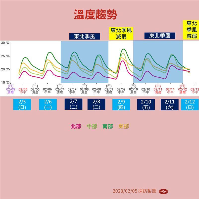 張承傳提醒,未來一週天氣系統變化快速,預報的不確定性升高,根據現有氣象資料,到了2月中下旬天氣將轉冷,至於溫度降幅會有多大,有待持續觀察。