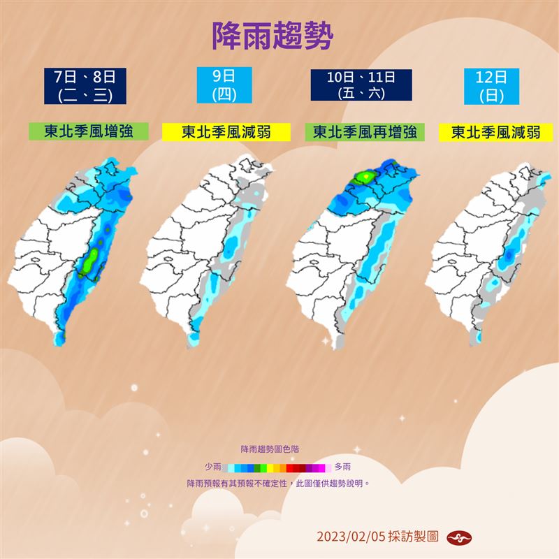 真空袋氣象局預報員張承傳指出,週一(2/6)將有一道鋒面在台灣附近形成並通過,各地下雨機率高,北部、東北部降雨範圍較廣,中部、東部、東南部局部有雨,南部也有零星降雨;週二週三東北季風增強,北部、東部仍有雨;週四東北季風減弱,水氣減少,剩下東半部、大台北山區有局部雨勢,其他地區多雲到晴;週五週六另一波東北季風增強,迎風面降雨再度增多,北部、東部又要回到陰雨綿綿的天氣。