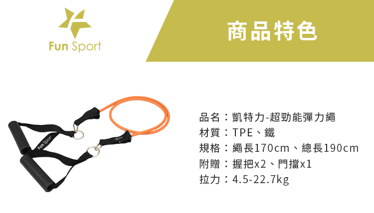 一起來看看這款【Fun Sport】凱特力-超勁能彈力繩-肌戰組-含握把1對+門扣+集力套+4拉力繩(彈力繩 拉力繩)吧!!!