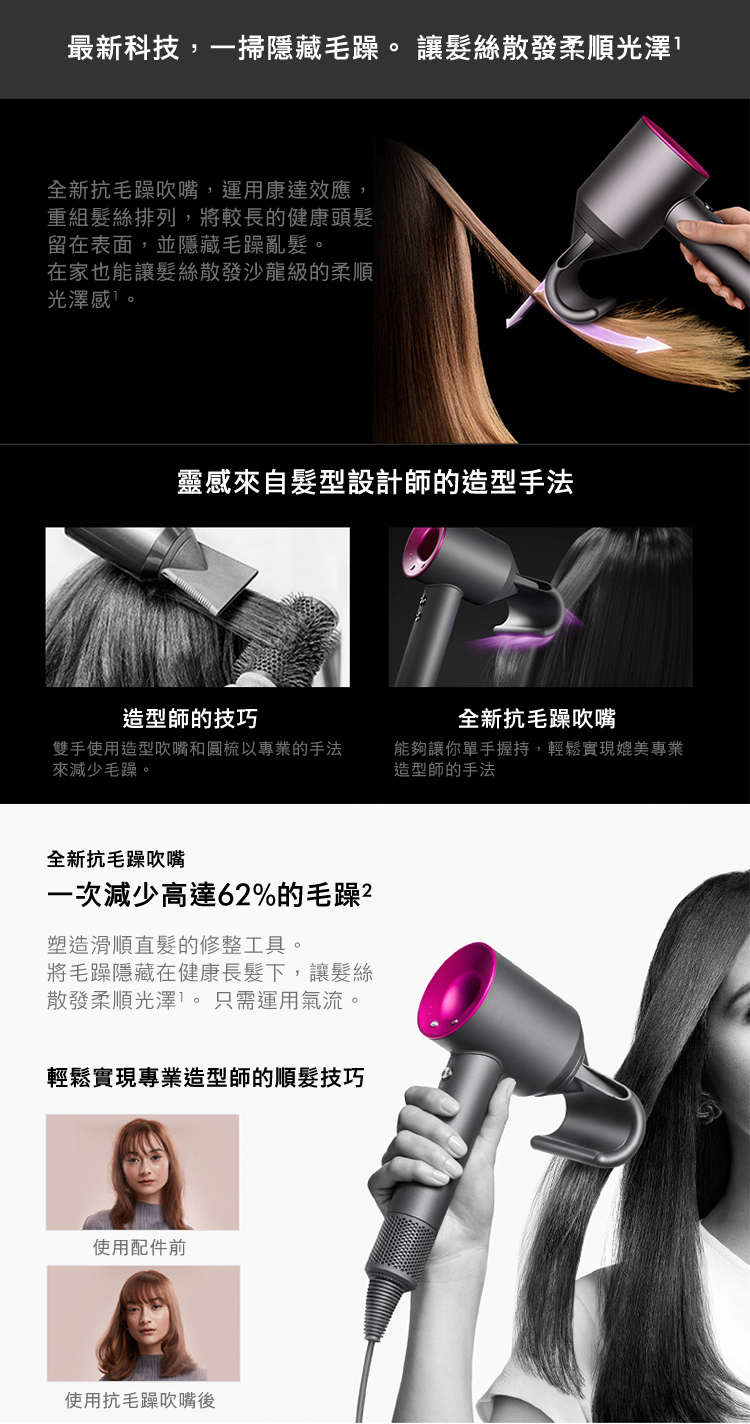 利用空氣即可達成自然柔順效果。運用康達效應撫平頭髮毛燥