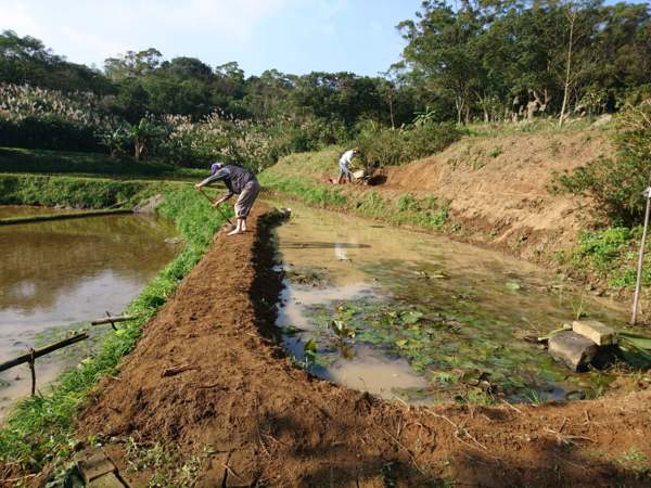 再一次整修田埂,高度不夠,從塌方田壁挖土用獨輪車運土加厚。