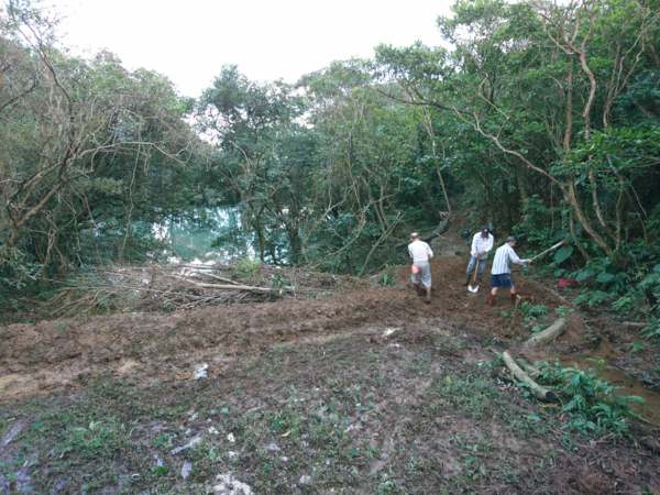30年來被沖出水路的水梯田,田埂已成水路,將它修起來,免得塌更大。
