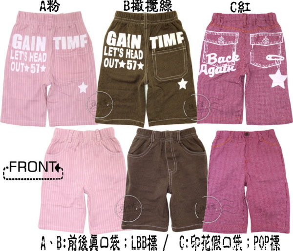【F061】F61造型條紋短褲 中褲 軟綿 細毛圈 短褲 五分褲 休閒 百搭~ 尺標~90.100.110.120.130.140 款式~A粉.B橄欖綠.C紅 售價~1件150元 |