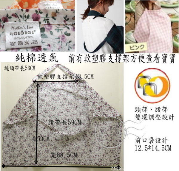 【H065】H65碎花餵奶巾 哺乳巾 授乳巾 遮羞巾 推車被 背巾被 立體領口 有頸撐 好收納 尺寸~如圖二!長*寬/59*88.5(此為平放平量,各人測量手法不同略有誤差2~3cm) 款式~如圖/A藍米花、B藍彩花、C咖啡花、D果紅花、E橘米花、F米玫瑰(因商品流動較為快速建議請先詢問您需要款式是否存貨,勿直接下標謝謝!) ☆洗滌方式:因為有立體領口頸撐,建議手洗亮乾即可,頸撐片較不易斷裂損壞! 單價~一件180元 |