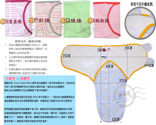 ☆材質~透氣綿材質,質料柔軟舒服! ☆適合新生兒、早產兒使用的包巾! ☆聰明/懶人/蠟燭包巾魔鬼氈式設計,可視寶寶身型自行調整鬆緊,包覆性佳讓寶寶有如在媽媽肚子裡一樣安穩舒適!適合新手爸媽使用~ ☆操作簡易,更換尿布時不必完全解開,可防止寶寶熟睡更加安穩不受到驚嚇! ◆請問此款包巾夏天(7月)適用嗎? ◆請問這款包巾,固定性好嗎?會不會小孩動一動就鬆了? ◆請問此款包巾新生兒可以抱到幾個月? ◆請問這算薄還是厚?適合什麼季節? ◆LBB製版,中國代工 ! |