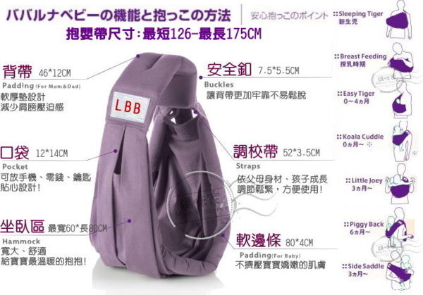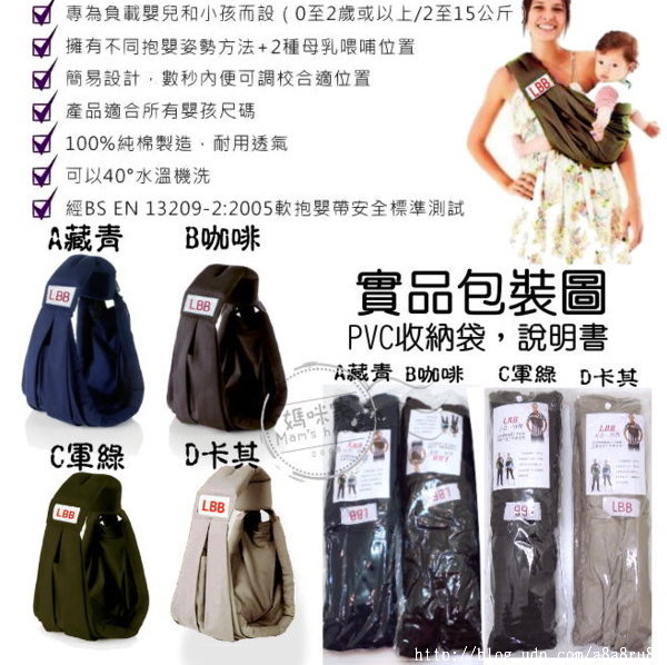 媽咪家【H036】H36抱嬰帶 五合一 減壓 輕便 可調整 袋鼠 子宮型 哺乳 揹帶 背巾 新生兒 適用年齡~0~2歲(2~15kg) 尺寸~如圖三(全長126~175cm) 款式~A藏青、B咖啡、C軍綠、D卡其 單價~1件~279元 |
