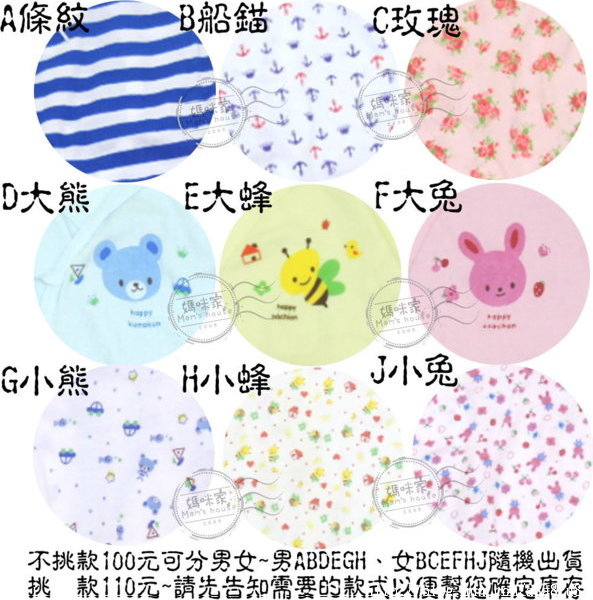 【S029】S29綿蝴蝶衣 純棉 新生兒 蝴蝶衣 連身衣 和尚衣 肚衣~可取代紗布衣 尺寸~單一尺寸新生兒適用! 款式~如圖款/A條紋、B船錨、C玫瑰、D大熊、E大蜂、F大兔、G小熊、H小蜂、J小兔 單價~不挑款/一件100元/隨機出貨!(可分男、女)(男不給CFJ款,女不給ADG款),挑款一件110元!如需挑款請告知另開網頁謝謝! |