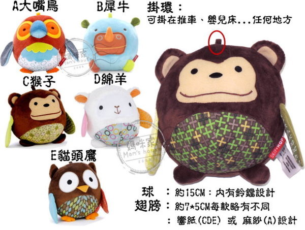 【N015】N15動物球 安撫球 抱抱球 可愛 動物 鈴噹 玩偶 可掛嬰兒床/推車~刺激聽/視覺 尺寸~球/約15cm、翅膀約7*5cm 款式∼如圖款/A大嘴鳥、B犀牛、C猴子、D綿羊、E貓頭鷹 單價∼一隻160元 ◆清洗方式:因內有鈴鐺設計,建議局部洗滌晾乾或濕布擦淨即可! |