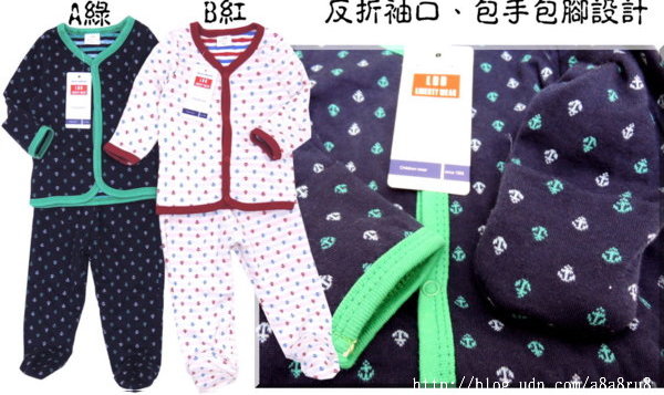 【AA028】AA28船錨小童套裝 前開 前釦 前扣 反折袖 包手 包腳 上衣 外搭 長褲~ 尺碼∼3.6.9.12M 款式~如圖款/A綠、B紅 單價~一套(上衣+長褲)160元 |