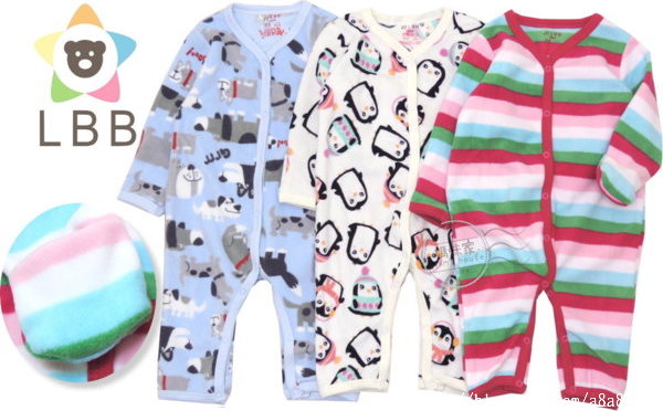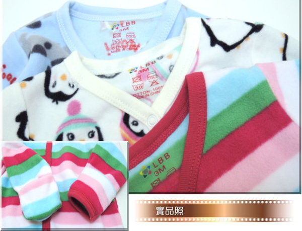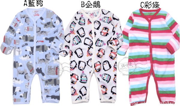 【AA038】AA38前開連身衣 新生兒 厚綿 綿絨 前開 前釦 反摺袖 反折 包手 爬服 平腳衣~3.6.9M 尺寸~3M.6M.9M 款式~如圖/A藍狗、B企鵝、C彩條 單價~一件120元 |
