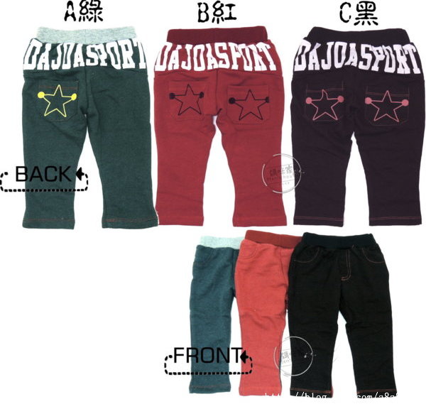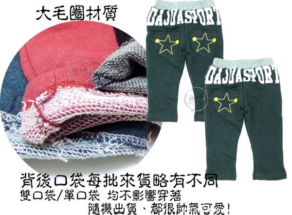【F069】F69星星長褲 毛圈 印花 休閒 百搭 伸縮 褲頭 中長褲 四季必備款 尺寸~86.90.100.110 款式~ 如圖/A綠、B紅、C黑(每批來貨背後口袋部份單一口袋、部分雙口袋,不影響穿著均採隨機出貨,介意者請勿下標!) 單價∼一件 150元 (商品頁下方均有提供庫存表,如有確定的款式請先在聯絡我們通知,以便保留商品) |