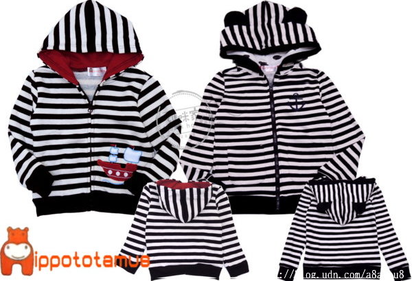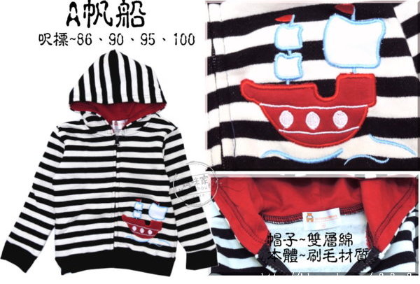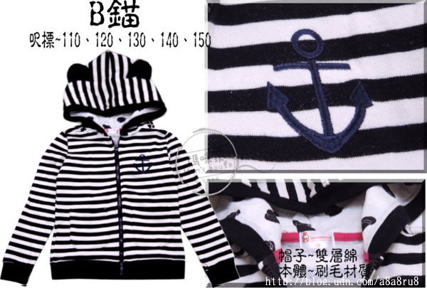 【AD030】AD30條紋連帽外搭 河馬牌 前開 厚棉 刷毛 小外套 尺寸~ 86.90.95.100/A帆船、 110.120.130.140.150/B錨 單價~一件190元 (商品頁下方均有提供庫存表,如有確定的款式請先在聯絡我們通知,以便保留商品) |
