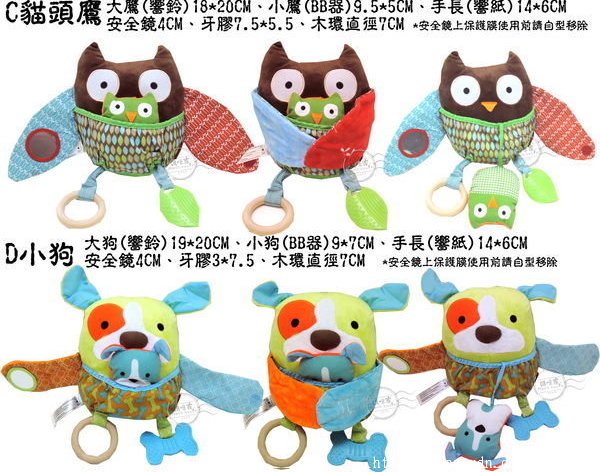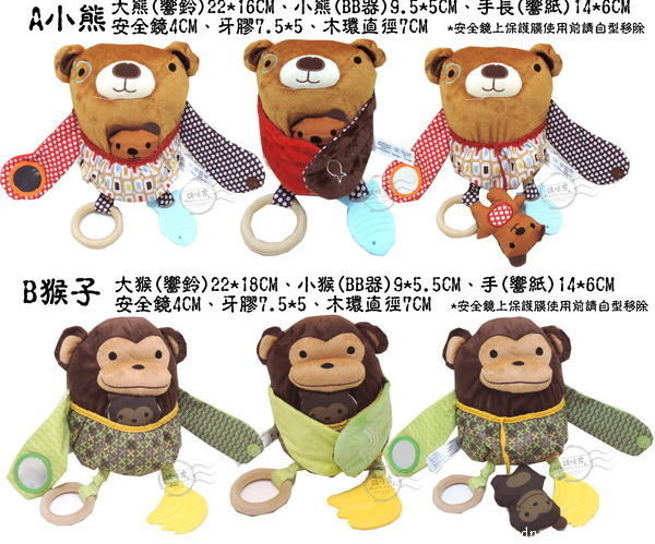 【N023】N23親子玩偶 安撫 可愛 動物 鈴噹 響紙 安全鏡 玩偶 可掛嬰兒床/推車~刺激聽/視覺 尺寸~如圖文字介紹! 款式∼如圖款/A小熊、B猴子、C貓頭鷹、D小狗(右手安全鏡上保護膜請自行撕除!) 單價∼一隻199元 ◆清洗方式:因內有鈴鐺/響紙/BB器設計,建議局部洗滌晾乾或濕布擦淨即可! |