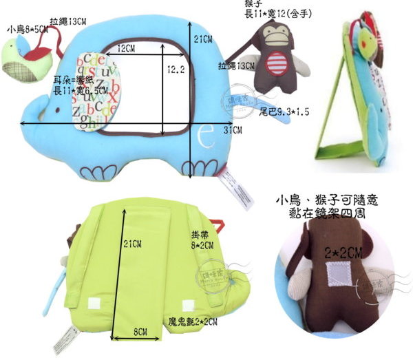 ◆材質~毛絨、不織布、綿布 填充物:聚酯纖維綿 ◆大象耳朵響紙夾層及肚子安全鏡設計,利用聲響、視覺,大象、小鳥後有魔鬼氈可任意移動黏附鏡架四周,可刺激寶寶手指末端神經抓握及滿足視覺、聲響感官好奇心! ◆可愛大象玩偶立鏡設計,寶寶長大了還可當擺設喔! ◆清洗方式:因內有響紙/安全鏡設計,建議局部洗滌晾乾或濕布擦淨即可! ◆立鏡後方雙邊掛帶設計,可綁掛在推車、嬰兒床、安全座椅使用,可爱的動物造型,色彩鲜艷,動一動耳朵就會聽到響紙聲響,刺激寶寶聲感! ◆視覺/觸覺神經的發育~可以安撫嬰兒的情緒~發展嬰兒的視覺追蹤能力~可發展嬰兒豐富的想像力~激發嬰兒的好奇心和興趣。 國外製版/中國代工製! |