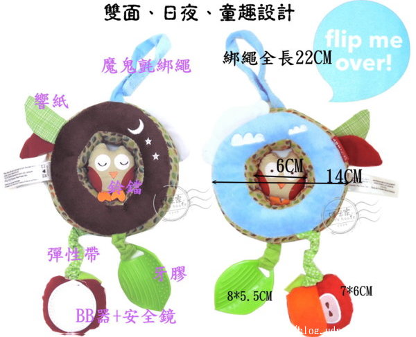 【N022】N22貓頭鷹掛飾 日夜 雙面 車掛 床掛 響紙 BB器 鈴噹 固齒器 安撫 刺激聽/視覺 尺寸~如圖三 款式∼如圖單一款式! 單價∼一個165元 ◆清洗方式:因有鈴鐺/BB器/固齒器/響紙設計,建議局部洗滌晾乾或濕布擦淨即可! |