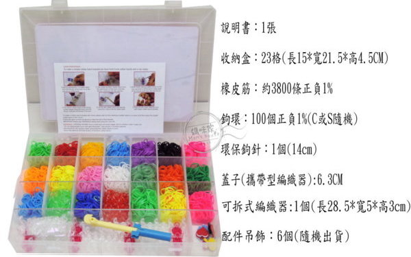 【N027】N27收納盒編織器 彩虹編織器 橡皮筋 編織 手鍊 手環 扣環 創意 DIY 益智 套件組 款式∼如圖盒款!(塑膠盒製包裝,運送過程難免擠壓破損,商品內容物為橡皮、膠製化材質難免會有氧化及消耗損傷,介意者請勿下標!!) 配件:收納盒23格、橡皮筋約3800條(正負1%)、扣環(C型或S型隨機)100個(正負1%)、環保鉤針*1、可拆式編織器*1、蓋子攜帶型(Y)編織器*1、配件吊飾*6(隨機)、說明書*1 尺寸:如圖二介紹! 單價:一組500元 |