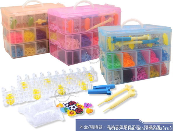 【N028】N28三層編織器 ◆(每批來貨透明提盒顏色均不相同,採隨機出貨界意者請勿下標謝謝!)◆ 手工 彩虹編織 橡皮筋 編織 手鍊 手環 創意 DIY 益智 套件組 款式∼如圖盒款!(塑膠盒製包裝,運送過程難免擠壓破損,商品內容物為橡皮、膠製化材質難免會有氧化及消耗損傷,介意者請勿下標!!) 配件:收納盒三層、橡皮筋23色約5000條(正負1%)、扣環(C型或S型隨機)200個(正負1%)、環保鉤針*2、可拆式編織器*2、蓋子攜帶型(Y)編織器*2、配件吊飾*10(隨機,有相同款)、說明書*1 PS.橡皮筋、勾針、編織器每盒配色均不相同,顏色均採隨機出貨!介意者請勿購買! 尺寸:如圖二介紹! 單價:一組780元 |