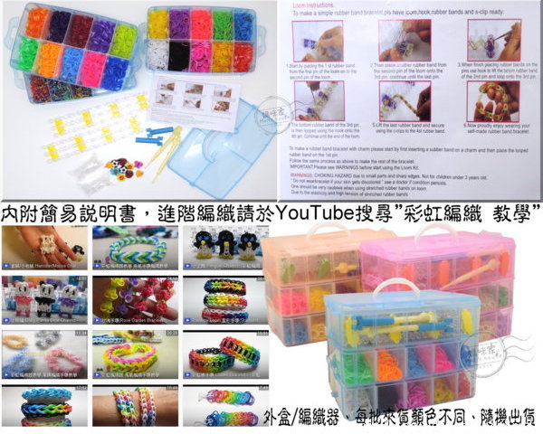 ◆材質~橡皮/壓克力/塑膠(難免會有氧化及消耗損傷、使用後均無法退換貨) ◆環保鉤針為塑膠材質,難免因拉扯、用力不當斷裂,建議可以加購鐵製鉤針http://www.mams.com.tw/content.php?cn=item&search=1&itemName=%E5%8B%BE%E9%87%9D ◆多種組合方式橡皮圈可隨心編織出多種手環、戒指、項鍊、髮飾、配飾、動物造型。。。等,益智DIY讓大小朋友都愛不釋手發揮想像力的手工創意玩具。