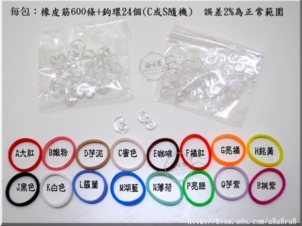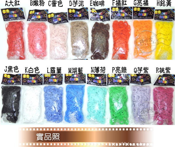 【N029】N29單色橡皮筋 編織配件 純色 橡皮圈 彩虹編織 補充包 創意 DIY 編織 益智 顏色∼如圖款/A大紅、B嫩粉、C蜜色、D芋泥、E咖啡、F橘紅、G亮橘、H銘黃、J黑色、K白色、L羅蘭、M湖藍、N薄荷、P亮綠、Q芋紫、R桃紫 數量:橡皮筋:包/600條、鉤環24個(C或S隨機出貨!)膠化製品誤差2%均為正常值(商品內容物為膠製化材質難免會有氧化及消耗損傷,介意者請勿下標!!) 單價:一包55元(因商品流動快速請告知需要顏色,確認存貨後再下標!3Q) |
