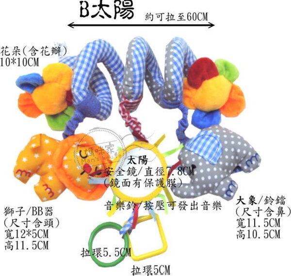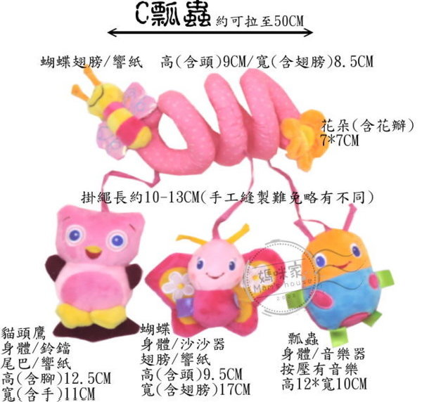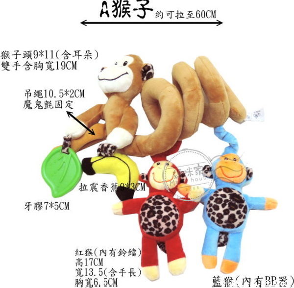 【N021】N21床繞 車掛 床掛 響紙 BB器 鈴噹 音樂器 固齒器 牙膠 安撫 刺激聽/視覺 尺寸~如圖介紹! 款式∼如圖款式/A猴子、B太陽、C瓢蟲(手工縫製商品難免有線頭外露非商品瑕疵,介意者請勿下標!謝謝!) 單價∼一個250元 ◆清洗方式:因有鈴鐺/BB器/固齒器/響紙設計,建議局部洗滌晾乾或濕布擦淨即可! |