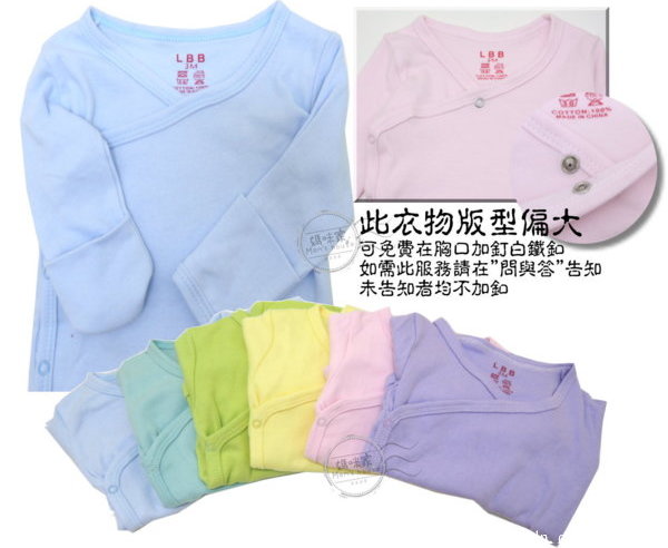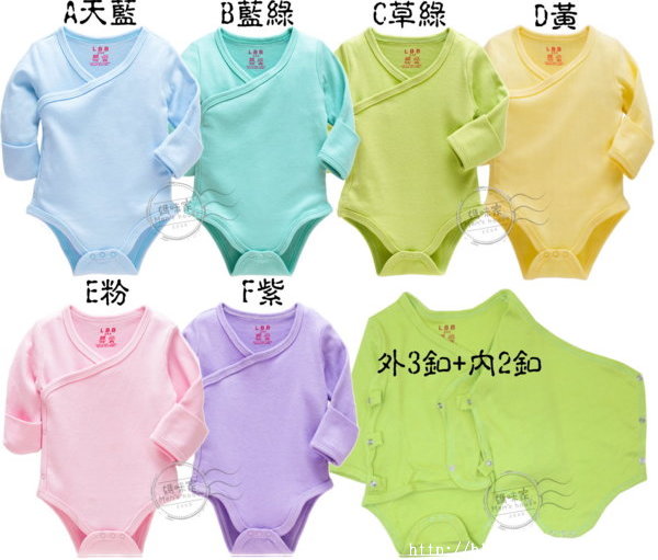 【AA046】AA46側釦包屁衣 長袖 前開 側開 包手 反摺袖 和服 開襟 哈衣 版偏大~ 尺寸~3.6.9.12M(此款版型偏大,因成長及各家版型均不盡相同建議請拿家中衣物平量對照商品頁尺寸較為準確!) 款式~如圖款/A天藍、B藍綠、C草綠、D黃、E粉、F紫 單價~1件90元 |