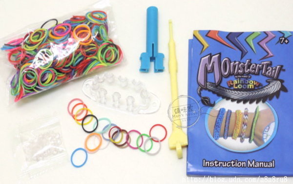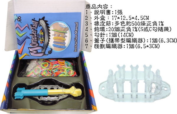 ◆材質~橡皮/壓克力/塑膠(難免會有氧化及消耗損傷、使用後均無法退換貨) ◆環保鉤針為塑膠材質,難免因拉扯、用力不當斷裂,建議可以鐵製毛線鉤針替代http://www.mams.com.tw/content.php?cn=item&search=1&itemName=%E5%8B%BE%E9%87%9D ◆多種組合方式橡皮圈可隨心編織出多種怪獸尾巴、手環、戒指、項鍊、髮飾、配飾、動物造型。。。等,益智DIY讓大小朋友都愛不釋手發揮想像力的手工創意玩具。
