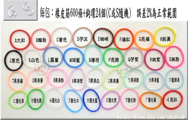 【N029】N29單色橡皮筋 彩虹編織 配件 橡皮圈 補充包 創意 DIY 果凍 螢光 益智 包/600條 顏色∼如圖款/ 基本色系列: A大紅、B嫩粉、C蜜色、D芋泥、E咖啡、F橘紅、G亮橘、H銘黃、J黑色、K白色、L羅蘭、M湖藍、N薄荷、P亮綠、Q芋紫、R桃紫、S桃粉 果凍系列: 螢光系列: 數量:橡皮筋:包/600條、鉤環24個(C或S隨機出貨!)膠化製品誤差2%均為正常值(商品內容物為膠製化材質難免會有氧化及消耗損傷,介意者請勿下標!!) 單價:一包55元(因商品流動快速請告知需要顏色,確認存貨後再下標!3Q) |