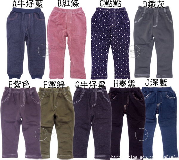 【F129】F129小童毛圈褲 中厚綿 毛巾圈 彈性 伸縮 素雅 百搭褲 長褲~ 尺寸~86.90.95.100(部份領標錯誤,依實際褲長及外袋標示為主,介意者請勿下標謝謝!) 款式~如圖款/A牛仔藍、B紅條、C點點、D鐵灰、E紫色、F軍綠、G牛仔黑、H墨黑、J深藍 單價∼一件100元 |