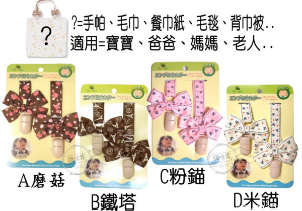 【B056】H56萬用繩夾 多功能 雙頭夾 圍兜夾 推車夾 帽夾 餐巾夾 背巾 被夾 固定夾 可調整 尺寸~單一尺寸!如圖三(各人測量手法有所不同略有誤差1~2cm均為正常值) 款式~如圖!A蘑菇、B鐵塔、C粉錨、D米錨 (蝴蝶結裝飾為熱熔膠黏著商品難免脫膠,可自行使用打火機烘過再次沾黏不影響使用!介意者請勿下標謝謝!) 售價~1卡一入80元 (商品頁下方均有提供庫存表,如有確定的款式請先在聯絡我們通知,以便保留商品) |