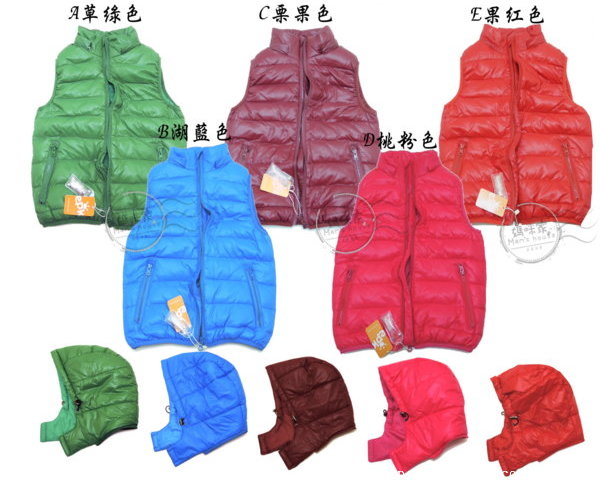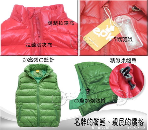 【AD038】AD38羽絨背心 epK 超輕量 防風 保暖 高領 護頸 含帽 馬甲 背心~ 尺標~130.140.150.160.170 款式~A草綠色、B湖藍色、C栗果色、D桃粉色、E果紅色 單價~1件450元 |