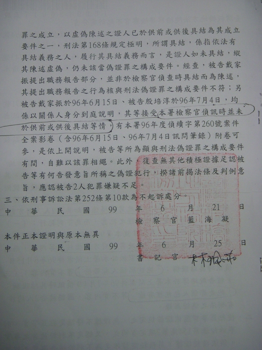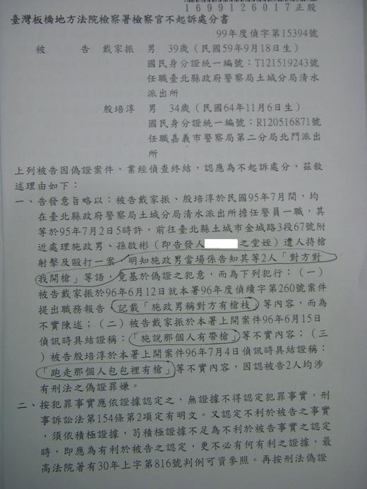 一、上述不起訴書之圖貼說明二位員警於96/6/1296/6/1596年偵續字第260偵查庭時,基於幫助脫逃與包庇槍擊案而在偵查庭上之偽(1頁第17-24)肇因該管檢察官未竟與二位員警具結,則發生與偽證罪之要件有間,自難以該罪相繩之結果(2頁第8-12)。據以說明,該管之檢察官依法應擔當未竟予與具結之責任,卻不擔當起應有之責任,甚至偽證行為的背後動機,幫助脫逃與包庇槍擊案亦置若罔聞,主管之板橋地檢署,卻未與究責,洵有包庇之嫌。