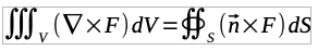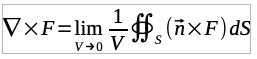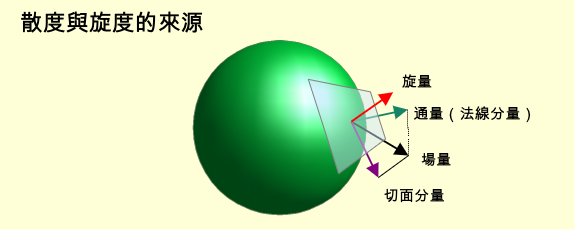 在三維歐幾米得空間中有一個可微分的向量場F。對於任何一個空間點,以該點為球心半徑r建立一個球形。球面上每一點都有一個切面及一個垂直與切面的法線方向。在這一點的向量可以分成一個法線分量與一個切面分量。法線分量用於散度,切面分量用於旋度。